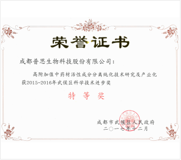 2017年 普思的科技項目“高附加值中藥成分分離純化技術研究及產業化”榮獲武侯區2015-2016年度科技進步特等獎;
